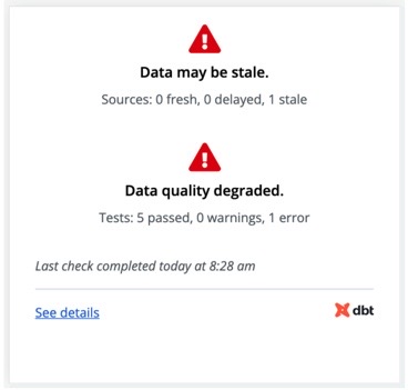 Embed data health tiles in your dashboards to distill data health signals for data consumers.Embed data health tiles in your dashboards to distill data health signals for data consumers.